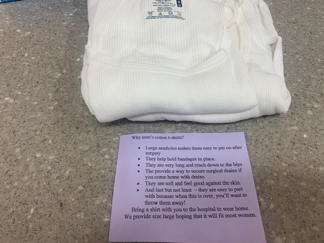 October is Breast Cancer Awareness Month. In October 2015, KJ learned she had cancer and was given a Necessities Bag to help her through her surgery. The bags are filled with "comfort items," such as oversized t-shirts, bandages, drain straps, a note pad, moistened cloths, lip balm, tissues and more. There are 2 hand-made cushioning pillows to protect tender bodies from seat belts, as well as a thank you card, and a booklet composed by women who have been through the surgery, giving helpful hints about what to expect before, during & after surgery.